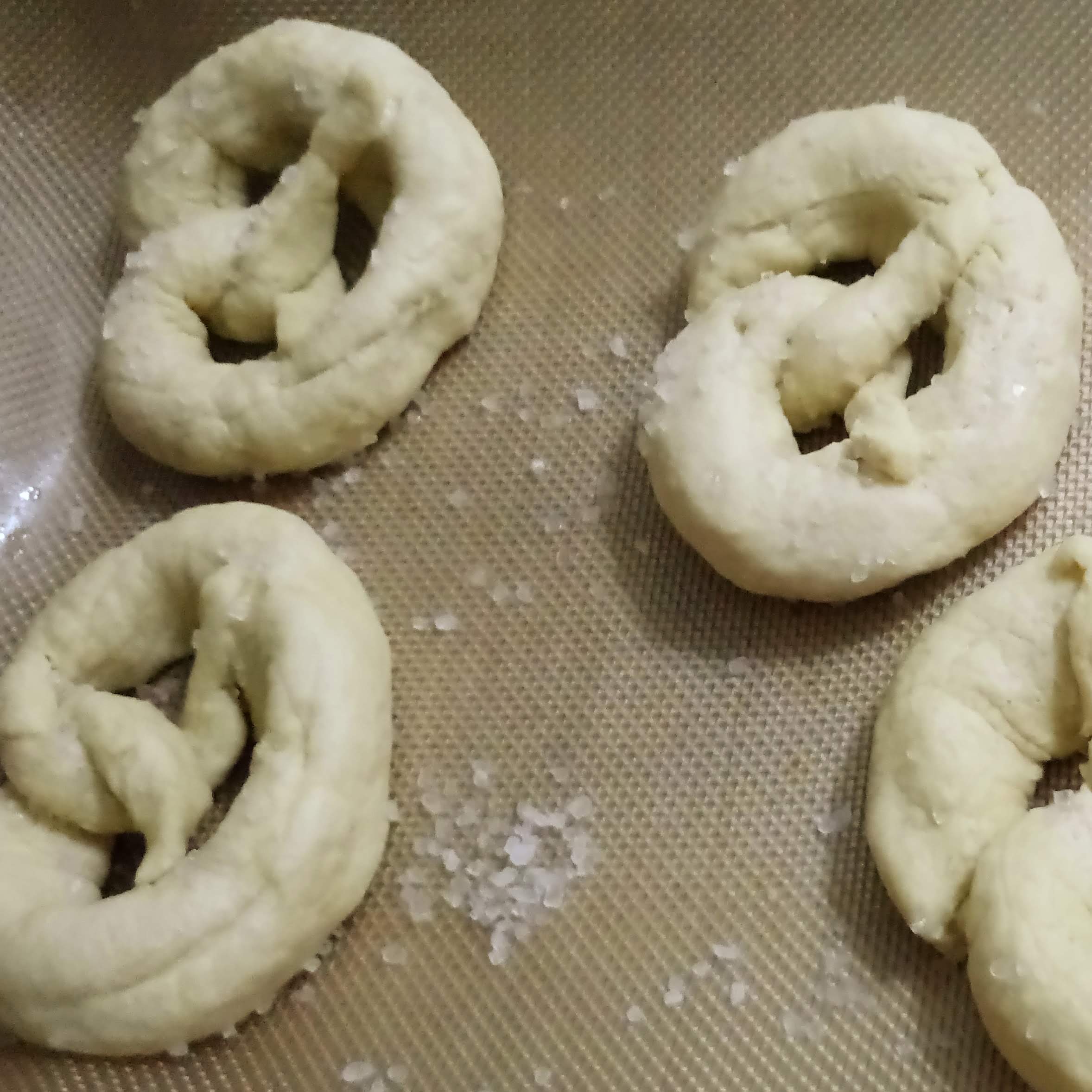 Ferver 1L de água e misturar 10g de bicarbonato, dissolvendo bem. Colocar os pretzels (um por vez) por 30s nessa água e retirar com uma escumadeira.