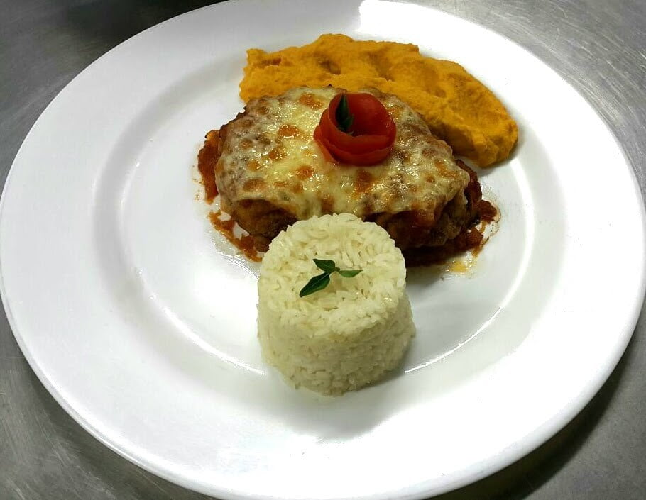 A nossa receita de Bife à Parmegiana foi feita com uma milanesa com farinha de arroz, ovo e farinha de rosca (para uma receita sem glúten, recomendamos utilizar a farinha de milho flocada no lugar da farinha de rosca). Fritamos de leve em pouco óleo e em seguida, cobrimos com muçarela, molho de tomate e levamos ao forno para dar aquela derretida de dar água na boca e deixar o bife bem macio!