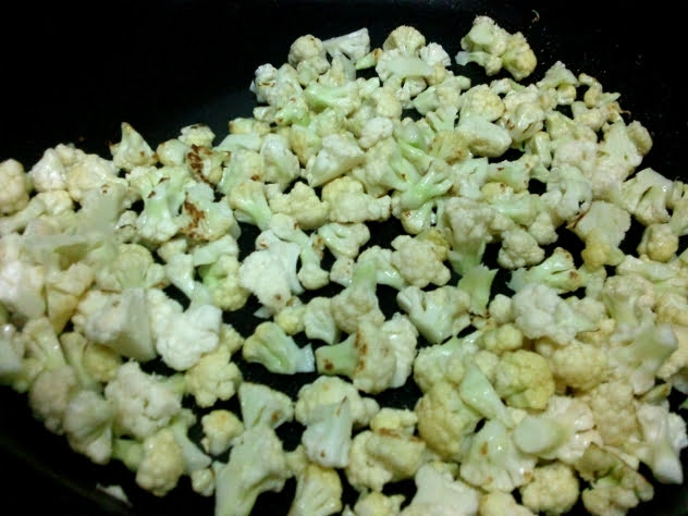 Em uma frigideira grande, colocar o azeite e aquecer a couve-flor por 10 minutos em fogo médio, até que refogue bem.
