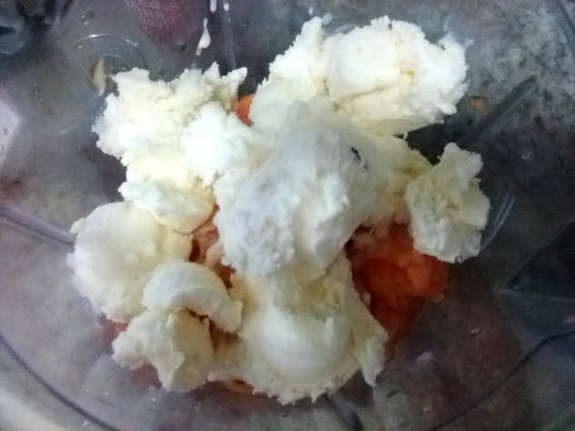 Em um liquidificador, colocar os pedaços de mamão papaya e o sorvete de creme. Bater por 5 minutos ou até que forme um creme homogêneo, com uma tonalidade de laranja mais claro.