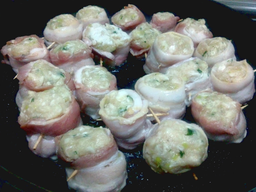 Pegar um punhado do frango e enrolar a fatia de bacon para formar o medalhão. Pode prender com palitos de dente (manterá o formato) e reservar.