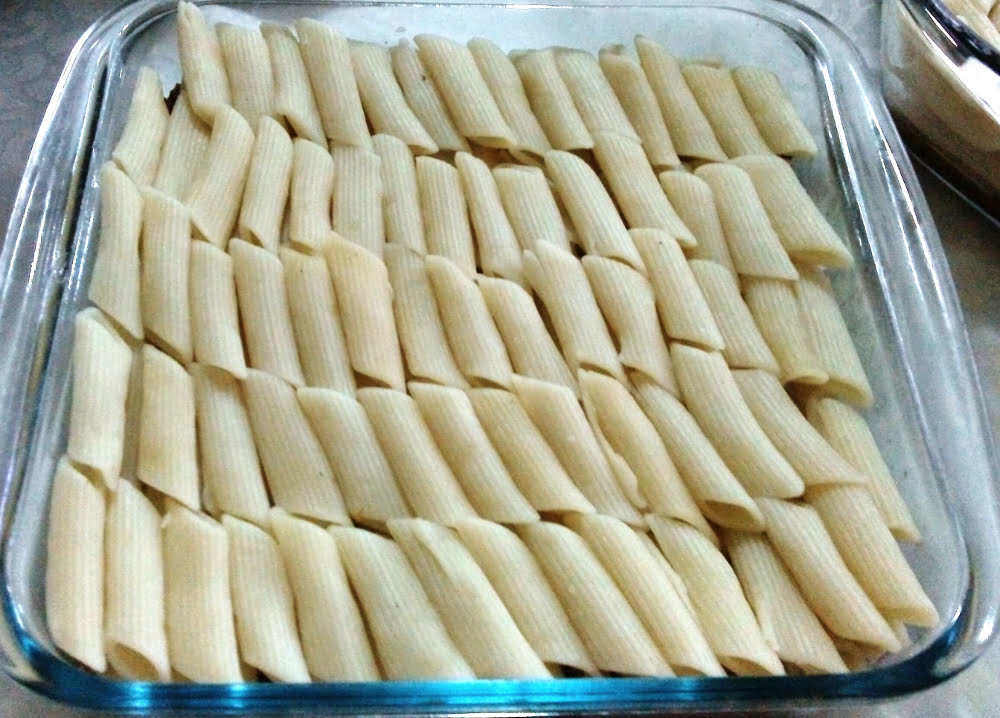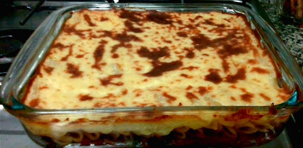 - Pré-aquecer o forno a 180°C, por 15 minutos. Em um refratário de vidro médio, colocar todo o Molho à Bolonhesa ao fundo (primeira camada). Fazer duas camadas de macarrão (se utilizar o penne). Cobrir a camada de macarrão com o Molho Béchamel.