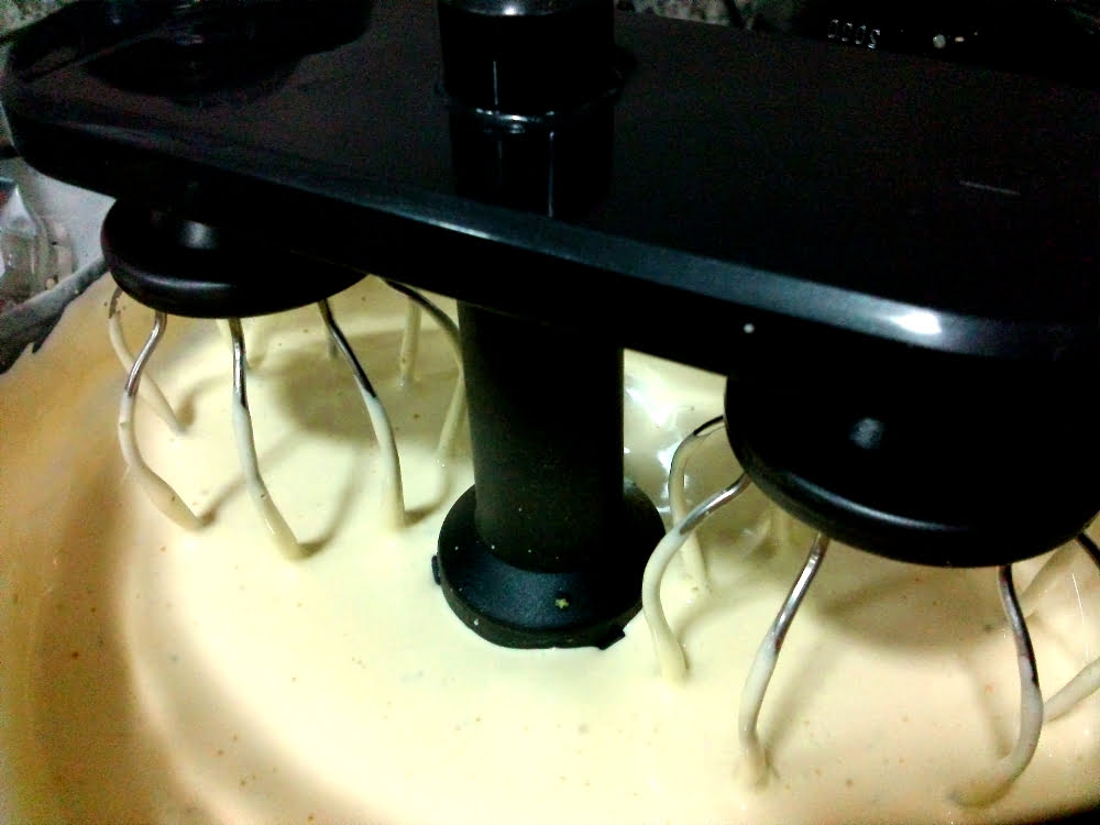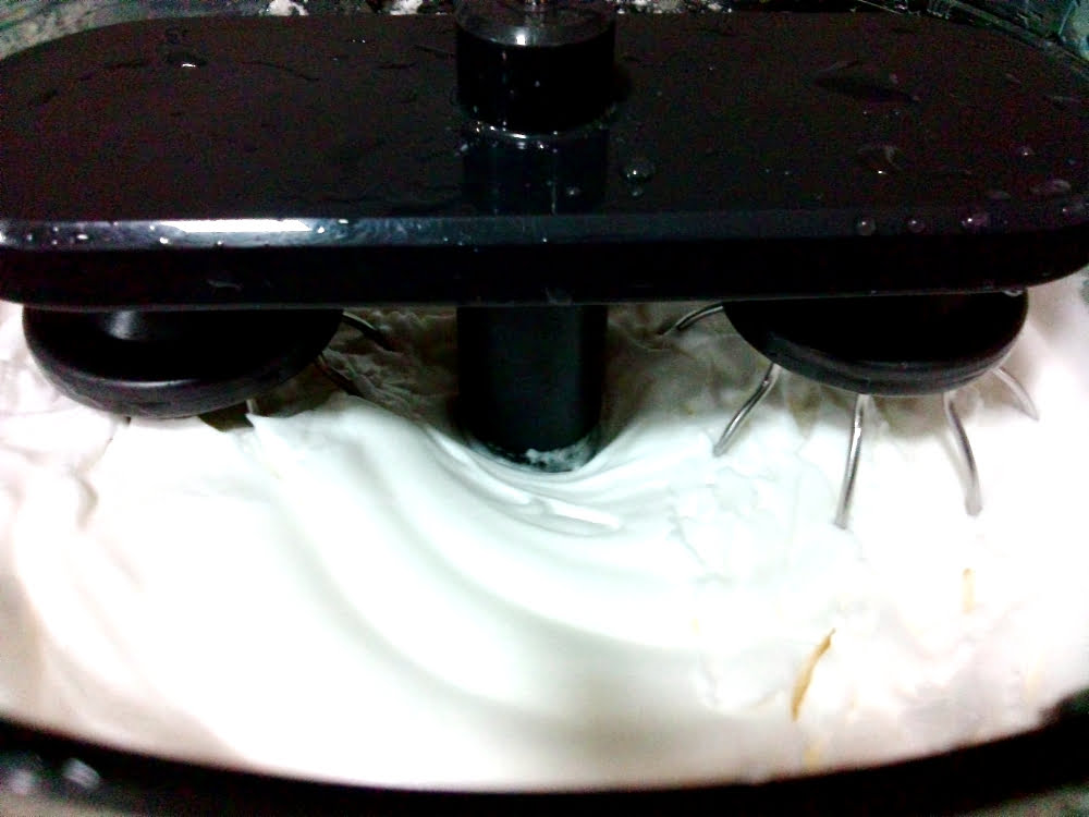 Na mesma batedeira (depois de lavá-la), bater as claras em ponto de neve (por 10 minutos em velocidade média) e adicionar o açúcar aos poucos (batendo por mais 5 minutos).