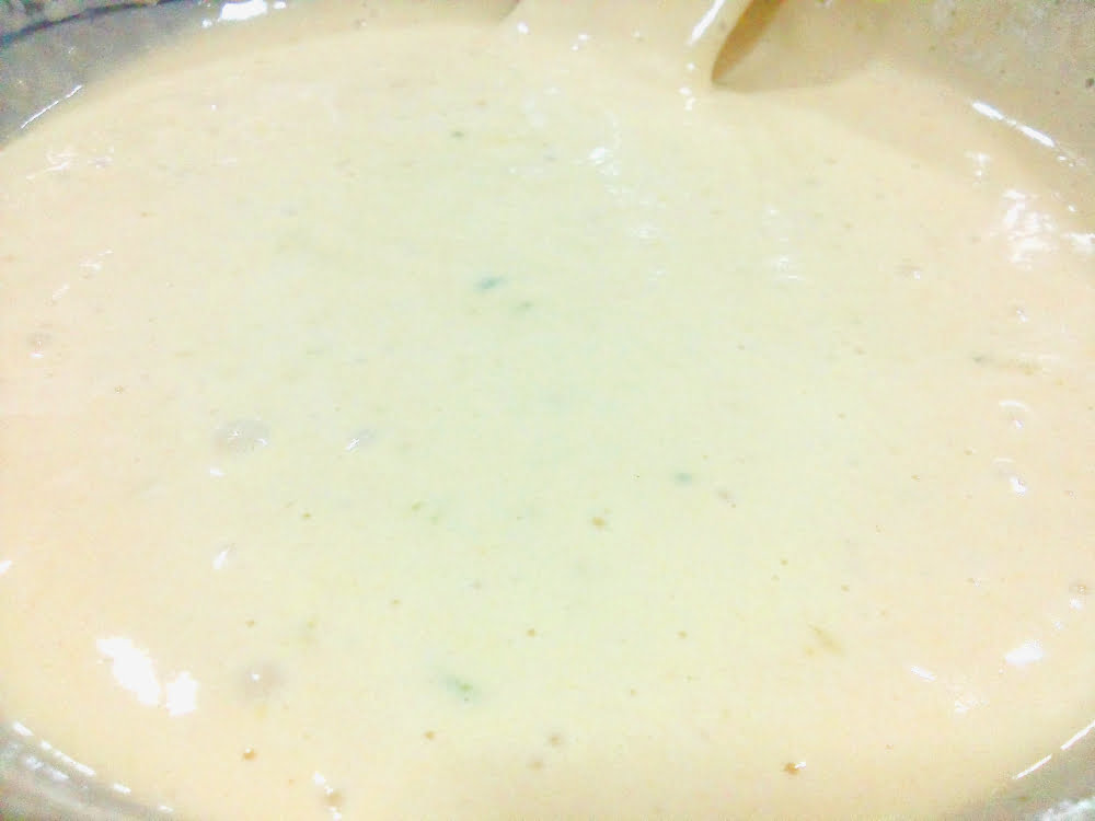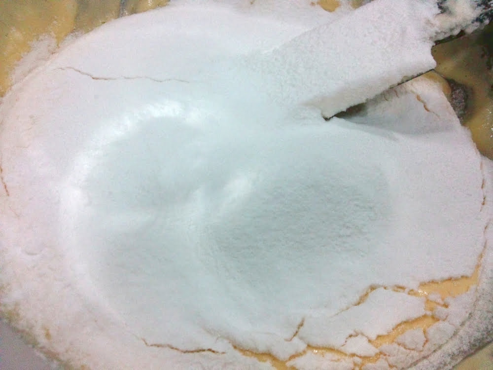 Em um recipiente (tigela grande), colocar as gemas batidas e metade da clara em neve. Peneirar a farinha de trigo e a fécula de batata. Com uma espátula, misturar bem por 5 minutos, até que se torne um creme claro, homogêneo e espesso.