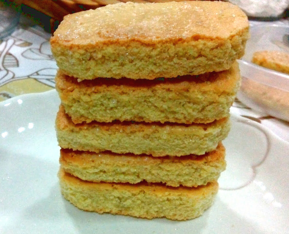 - Pré-aquecer o forno a 180 °C por 15 minutos. Cobrir uma assadeira ou forma de alumínio com papel-manteiga (os biscoitos grudam bastante). Utilizar saco e bico de confeiteiro (ou um saco mais longo rígido e cortar a ponta) para modelar os biscoitos um a um, deixando 2cm de espaçamento (receita original) ou colocar toda a massa no papel-manteiga e ir cortando os biscoitos (como fiz). Polvilhar os biscoitos com açúcar e assar os biscoitos por 20-30 minutos a 200°C, até ficarem dourados na superfície.