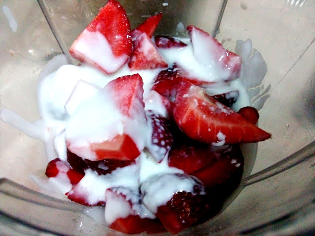 - Em um liquidificador, colocar os cubos de gelo, os morangos, o iogurte, a água e o açúcar. Bater até ficarem com uma cor bem rósea (5 minutos, potência média), formando o smoothie. Se os morangos estiverem um pouco menos adocicados, pode colocar mais açúcar.