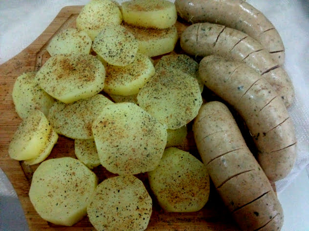Servir ainda quente! Pode acrescentar mostarda escura na salsicha e nas batatas. Dá um sabor maravilhoso ao prato!