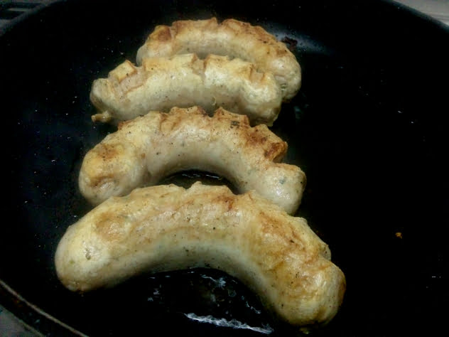 Na mesma frigideira, colocar as salsichas brancas e fritar bem dos dois lados (5-10 minutos em cada lado).