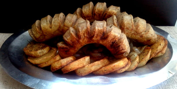 Em uma frigideira, acrescentar a manteiga e o óleo. Adicionar as batatas temperadas e deixar dourar bem de cada lado (5-10 minutos em fogo médio). Reservar.