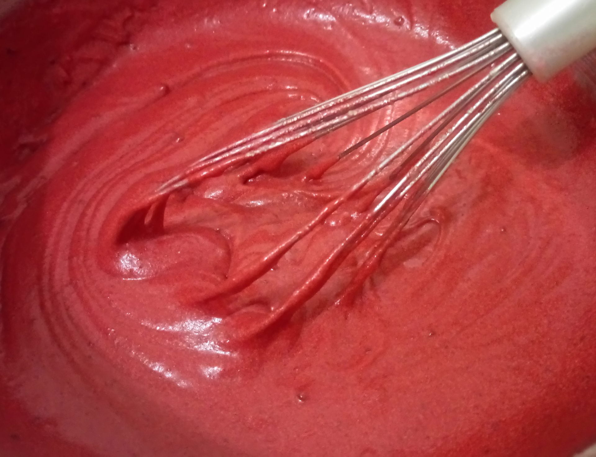 2. Bata a manteiga e o açúcar até obter uma pasta cremosa. Depois acrescente os ovos (um de cada vez), o buttermilk, o vinagre, a essência de baunilha e o corante vermelho.